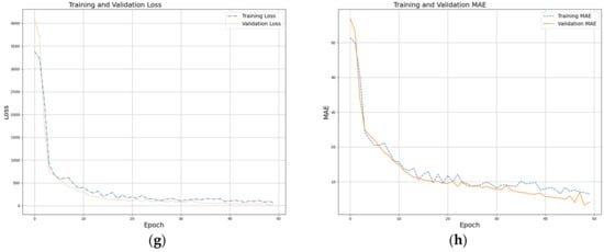 Training curves for best configurations across all CNNs: (a) training and validation loss for current prediction; (b) training and validation MAE for current prediction; (c) training and validation loss for diameter prediction; (d) training and validation MAE for diameter prediction; (e) training and validation loss for the prediction of the number of turns; (f) training and validation MAE for the prediction of the number of turns; (g) training and validation loss for the prediction of the number of layers; (h) training and validation MAE for the prediction of the number of layers.