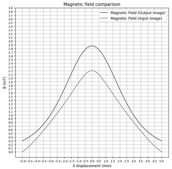 Figure 16 demonstrates an experiment with a smoothed curve, generated using interpolation from magnetic field data extracted from the input image. The curve of the output magnetic field corresponds to the magnetic field of the planar coil generated by the model.