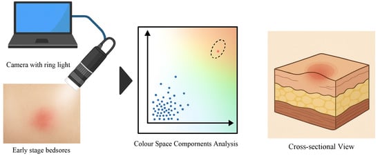 This study is a fundamental evaluation to verify whether minute circulatory changes in the skin caused by external pressure can be quantitatively captured using camera-based imaging and colour space analysis. By establishing the ability to non-invasively monitor these early circulatory changes, the goal is to detect early-stage pressure ulcers that are difficult to detect by conventional visual inspection, as illustrated in Figure 3.