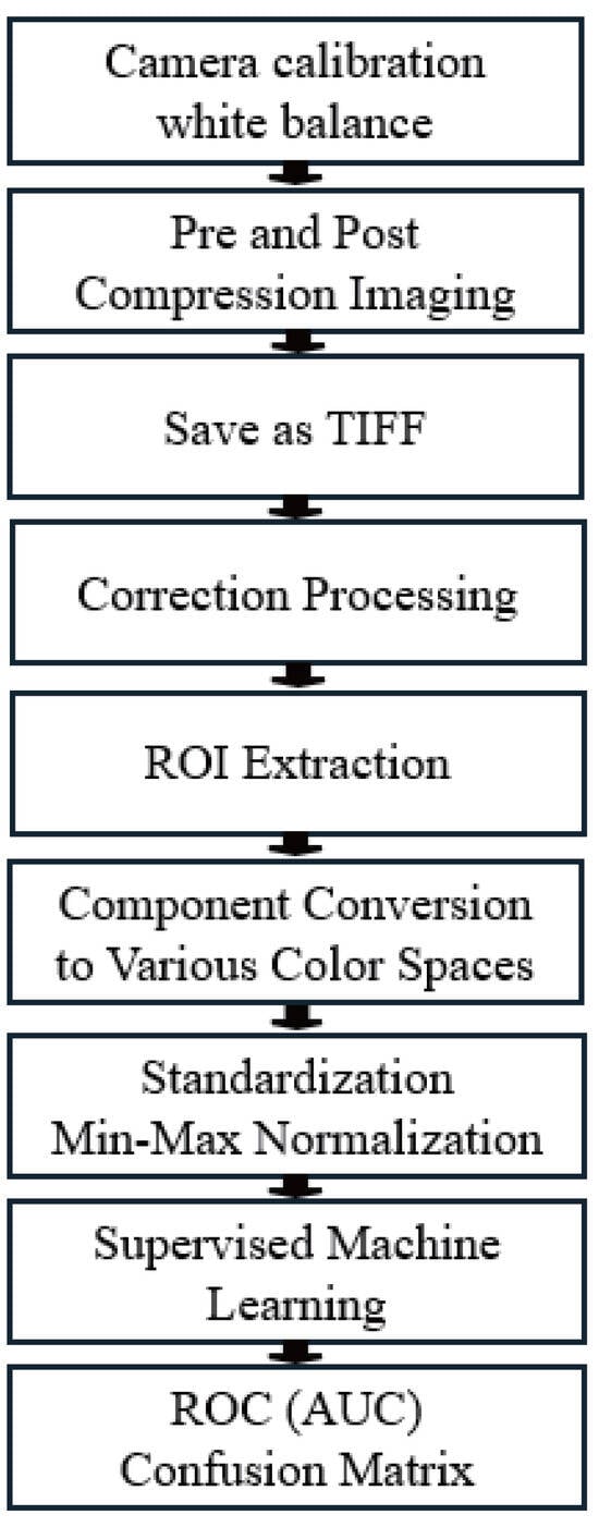 To define the classification objective variable, a single representative frame was extracted from each subject. Class 0 was defined using a frame captured under stable baseline conditions before cuff inflation, representing the resting state of peripheral circulation, while Class 1 was defined using a frame captured immediately after cuff release, corresponding to the early reperfusion phase. Frame selection was performed according to a standardized protocol across all subjects, ensuring consistency and physiological comparability. This approach allowed for the construction of a balanced dataset focused on the representative skin colour transition induced by pressure application and release. Finally, supervised machine learning (ensemble bagging) was used to perform 5-fold cross-validation, and the top components in the AUC obtained were evaluated using ROC curves and standard classification metrics, including AUC, precision, recall, and F1 score. Statistical significance of the results was also assessed using appropriate hypothesis testing.