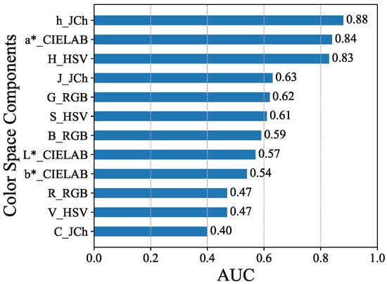 Figure 7 shows the results of each component and AUC. In order from top to bottom, the top three components, h_JCh = 0.88, a*_CIELAB = 0.84, and H_HSV = 0.83, showed higher performance compared to others. The performance of the other components was in the range of 0.63 to 0.40, and showed clearly lower results compared to the former.