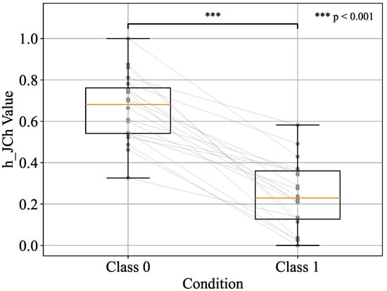 Boxplot representation of h_JCh values for Class 0 and Class 1 conditions.
