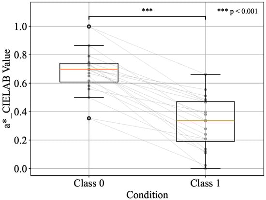 Boxplot representation of a*_CIELAB values for Class 0 and Class 1 conditions.