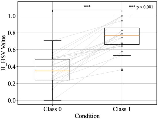 Before performing the paired t-test, the normality of Class 0 and Class 1 was assessed using the Shapiro–Wilk test for each of the top three components—h_JCh, a*_CIELAB, and H_HSV. The results confirmed that all components met the assumption of normality (), thereby justifying the application of the parametric test. Based on these results, a paired two-sample t-test was then conducted on the standardised values between the two classes. The distributions of each component are visualised using box plots in Figure 8, Figure 9, and Figure 10, respectively.