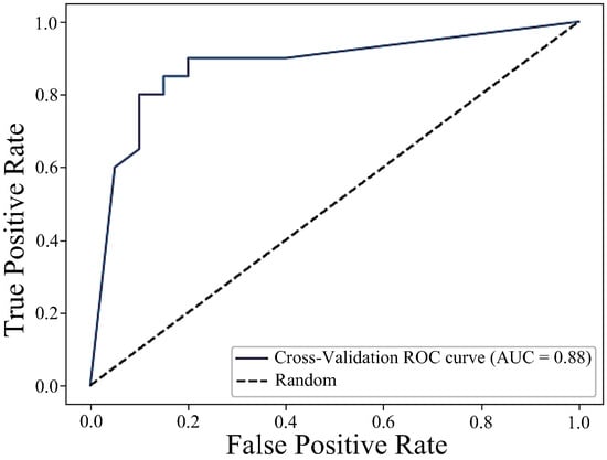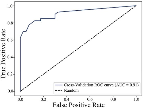 where represents True Positives, represents False Negatives, represents False Positives, and represents True Negatives. Additionally, the Area Under the Curve (AUC) represents the area under the ROC curve and is a numerical measure to evaluate the performance of the classification model as described in (5). Generally, the AUC value ranges from 0.5 to 1.0, and the higher the value, the better the classification performance. A value closer to 1 indicates an ideal classification. However, when class imbalance is significant, FPR might be underestimated, so the precision–recall curve is sometimes used instead.