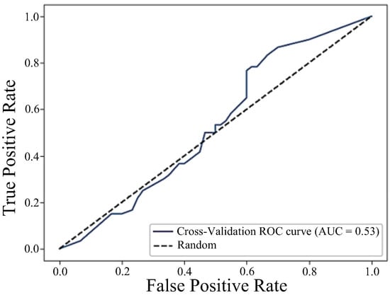 Finally, Figure 13 shows the ROC curve for the model using the top three components h_JCh and a*_CIELAB, and H_HSV as explanatory variables. This model had a low AUC of 0.53, a precision of 0.52, a recall of 0.50, and an F1 score of 0.51, making it a model with low classification performance.