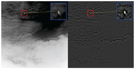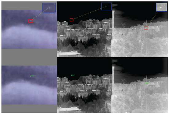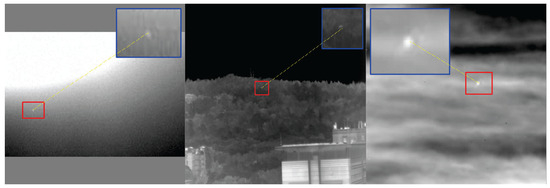 Infrared target detection technology detects targets based on differences in the infrared radiation emitted by the targets and their surroundings [1]. Infrared small-target detection (IRST) is a valuable and highly challenging research field with significant applications in military reconnaissance, environmental monitoring, forest-fire prevention, search and rescue, and other areas [2,3,4,5,6,7]. However, IRST faces a series of unique challenges that differ from those of general target detection. Small infrared targets are typically extremely small, often occupying only a few pixels in an image. They lack texture and shape information and often appear as blurry spots. Images have low signal-to-noise ratios and are susceptible to atmospheric and sensor noise. Complex backgrounds, such as clouds, ground clutter, and building edges, are similar in appearance to small targets and easily cause false alarms (Figure 1). These factors make accurately and robustly detecting small targets from complex infrared images difficult.