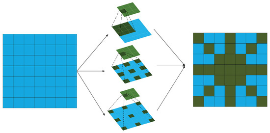 - Multi-scale cavity integral branch (Formula (3)):Perform parallel depth-separable convolutions in each channel of F with expansion rates of 1, 2, and 3. Denote the corresponding weights as (Equation (3)):then Concatenate along the channel dimension to obtain . Multi-scale dilated convolutions effectively expand the receptive field through a depthwise separable convolution structure, enhancing the model’s feature extraction ability while avoiding a significant increase in computational cost. The comparison of receptive fields is shown in Figure 3.
