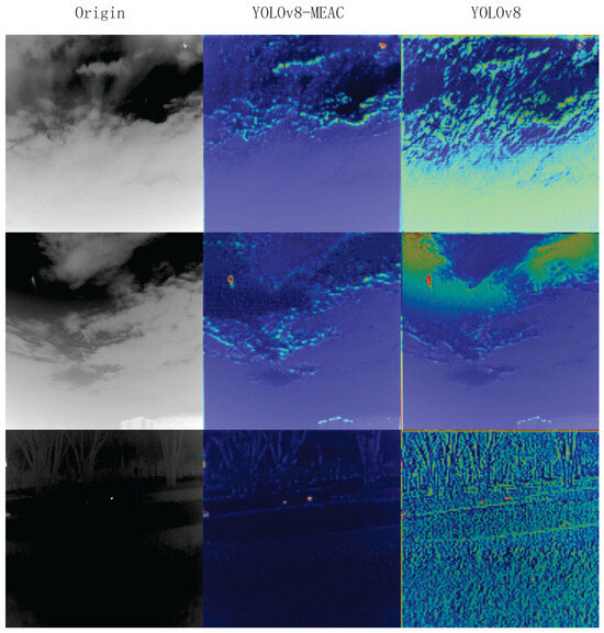 - Enhanced feature discrimination capability: MEAC generates clearer feature maps, which makes the separation between foreground objects (objects of interest) and the background more distinct. This is evident in the higher intensity and more concentrated spatial distribution of the ’hotspot’ regions of target objects.