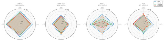 - YOLOv11n: The optimal insertion shifts to the network front (place1). On IRSTDv1, all four metrics achieve their maximum gains: Precision +4.85%, Recall +11.66%, mAP50 +4.45%, and mAP50-95 +4.54%. On SIRST-UAVB, performance improvements are even more pronounced (Precision +9.44%, Recall +10.11%, mAP50 +9.67%, mAP50-95 +5.79%). Although place2 yields the highest mAP50 gain (+3.31%) on IRSTD-1k, the overall performance remains inferior to place1.