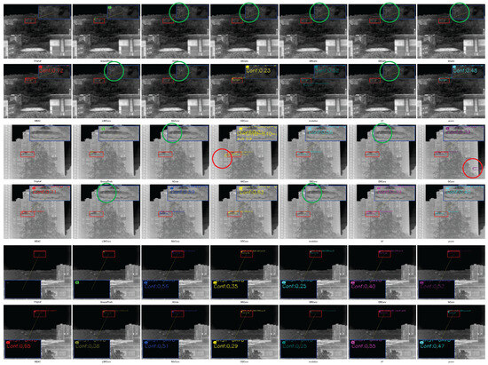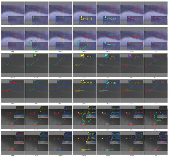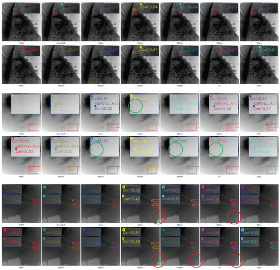 We compared the detection results of each convolutional module by selecting representative samples from each dataset for visualization (Figure 10, Figure 11 and Figure 12), where green circles indicate missed detections and red circles indicate false detections.