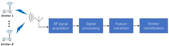 The block diagram of the RFFI system outlines the following sequence: The process begins with the emission of signals from multiple sources. These signals are captured by a receiver, after which they undergo signal processing. This step typically includes operations such as filtering, amplification, and the conversion of the signals from analog to digital form. Once processed, the system proceeds to the feature extraction and identification phase, where distinctive characteristics or “fingerprints” of the signals are identified.