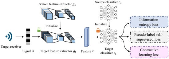 The overview of proposed method CSCNet. The model comprises two primary components: the feature extractor (g) and the classifier (C). The role of the feature extractor g is to extract emitter’s fingerprint from the received signal, while the classifier C maps the feature to the corresponding class. Our method involves loading the source model and , which are pre-trained on the source domain . Then, we freeze the parameters of and update the feature extractor g to adapt the target domain . Three kinds of losses are considered, namely, information entropy loss, pseudo-label self-supervised loss, and contrastive learning loss.