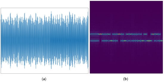 HackRF, a cost-effective open-source software radio platform, is used to generate and collect the HackRF dataset, which includes signal data. Data collection involved four HackRFs as transmitting terminal devices and three HackRFs (referred to as HackRF 1, 2, and 3) as receivers. Signals were generated using Matlab and modulated using BFSK with a 2 MHz sampling rate. To introduce randomness, amplitude and frequency noise were uniformly added to the signals. This process ensures the dataset simulates realistic communication environments where signal quality can be degraded, thereby providing a basis for evaluating the model’s robustness against noise. The transmitted signals passed through a relatively fixed channel and were moved to the intermediate frequency (IF) before being received by the receiving device. The collected signals were transformed into signal time-domain samples using data frames, with each time-domain sample containing 28,000 sampling points. By performing short-time Fourier transform (STFT) on each time-domain signal sample, the corresponding spectrogram is obtained. The time-domain signal and its spectrum are illustrated in Figure 3.