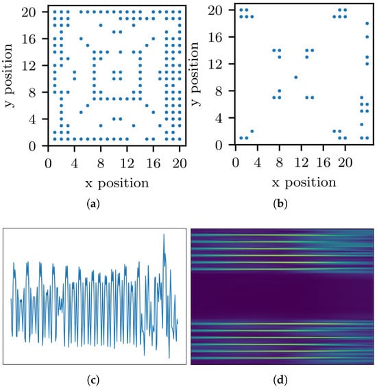 The Wisig dataset [16] is a large-scale WiFi dataset containing 10 million packets obtained from 174 off-the-shelf WiFi transmitters (Tx) and 41 USRP receivers (Rx) across four captures over a month. The Tx and Rx are deployed on nodes arranged in a grid. The 2D-coordinate scattergram of Tx and Rx is shown in Figure 4a,b, respectively. For our experiment, we used the ManySig subset provided by the dataset, comprising 1000 equalized signals from all Tx-Rx pairs, including 6 Tx and 12 Rx, spanning over four days. As a large-scale dataset captured in a real-world environment, its signals inherently encompass a range of channel effects and authentic signal-to-noise ratios, offering a practical benchmark for the model’s performance under non-ideal conditions. The time-domain signal and its spectrum of Wisig dataset are illustrated in Figure 4c,d. Each signal contains two channels and 256 sample points. During the cross-receiver test, the dataset is divided into 12 parts, each corresponding to a receiver with capturing time spanning over four days. The time-domain signal and its spectrum of Wisig dataset are illustrated in Figure 4c,d.