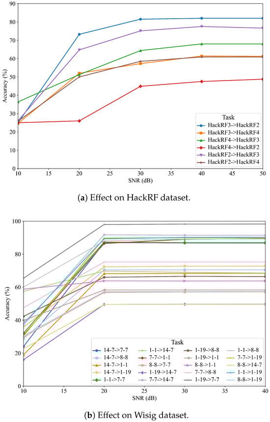 Figure 5a illustrates the performance of CSCNet on the HackRF dataset under different SNR conditions. As expected, the model’s accuracy is significantly impacted by noise. At a low SNR of 0 dB, the performance is generally poor across all tasks, with accuracies ranging from 25% to 36%. However, as the SNR increases to 5 dB and 10 dB, there is a substantial improvement in accuracy. For instance, in the ‘h2 → h3’ task, the accuracy jumps from 26.12% at 0 dB to 75.12% at 10 dB. For most tasks, the performance tends to saturate or plateau when the SNR is 10 dB or higher, indicating that the model performs robustly in moderately noisy environments.