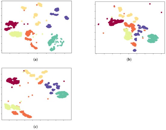 t-SNE visualization of the learned feature representations, providing a qualitative assessment of the model’s effectiveness. In all subplots, different colors are used to distinguish signals from different transmitter classes. The clustering of same-colored points and the separation between different-colored clusters visually represent the model’s classification capability. (a) Features from the source domain data, extracted by the source-trained model, show clear and well-separated class clusters, representing the ideal performance baseline. (b) When the source model is applied directly to the target domain data, the feature representations of different classes (colors) become heavily overlapped and indistinguishable, visually demonstrating the severe impact of the domain shift problem. (c) Features from the target domain data, extracted by our proposed CSCNet model, show that the class-specific clusters (colors) are reformed and become significantly more separable, which powerfully demonstrates the effectiveness of our source-free adaptation method.