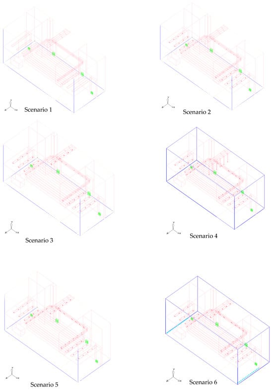 Working conditions and simulation scenarios. (In the figure, the blue color represents the calculation area, the deep red color represents the supply air outlets, the red color represents the blocks and pipes, the green color represents the exhaust air outlets, and the light blue color represents the fans.).