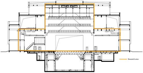 With the growing demand for high-performance public cultural facilities, modern theaters have evolved into complex spaces that must balance functionality, occupant comfort, and energy efficiency []. Among these, the stage space—a core functional zone—presents unique thermal and ventilation challenges due to high occupant density, dense lighting equipment, and semi-enclosed architectural layouts. These characteristics often lead to thermal stratification, heat accumulation, and airflow stagnation, severely compromising thermal comfort for performers and equipment safety. While previous studies have explored general ventilation strategies and HVAC solutions for large spaces, most research has concentrated on lecture halls or auditoriums, with relatively limited focus on stage-specific spatial conditions []. Existing approaches also often address single-variable optimizations [,], lacking an integrated methodology that accounts for spatial configuration, equipment layout, and active airflow control []. In traditional theater design, the thermal environment of the stage space is often overlooked, leading to issues such as temperature unevenness and poor air circulation. These problems can affect the comfort and performance of the performers and may even impact the overall quality of the production []. The stage area typically accommodates a large number of lights, set pieces, and electrical equipment. While these factors contribute to an increased thermal load, they can also lead to uneven temperature distribution []. To improve the thermal environment of theater stage areas, researchers have gradually integrated airflow organization with thermal environment optimization. Proper airflow distribution not only reduces thermal load and temperature differences but also provides more efficient ventilation, exhaust, and cooling effects []. With the advancement of architectural design concepts and the development of simulation technologies, an increasing number of studies have begun to employ numerical simulations, experimental research, and case analyses to explore various methods and strategies for optimizing airflow organization in stage spaces []. However, although existing studies have provided a theoretical foundation for optimizing the thermal environment of theater spaces, research specifically focused on the unique environment of the theater stage remains relatively limited []. This gap leaves the question of how to systematically optimize airflow distribution in complex stage environments largely unresolved. Therefore, this study aims to bridge this gap by proposing a multi-dimensional optimization strategy that combines computational fluid dynamics (CFD) simulations, architectural layout analysis, and perturbation techniques to improve airflow performance and thermal comfort in theater stage spaces. The main research objectives are as follows: