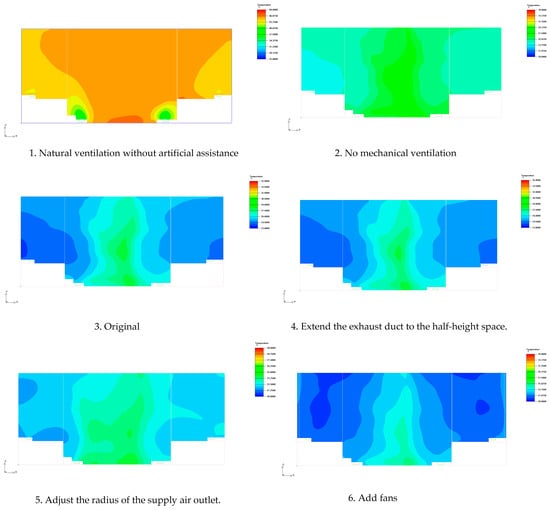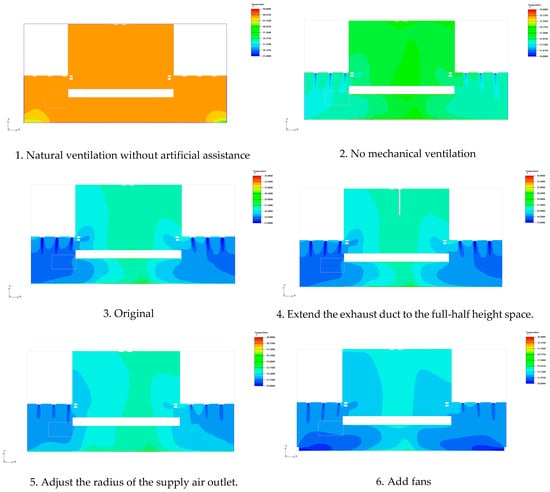 Table 4 outlines the configuration details of the six simulation scenarios (S1–S6) designed to evaluate and improve airflow and thermal performance within the theater stage space. All scenarios were modeled under a constant total supply airflow condition to ensure comparability, while key parameters such as diffuser radius, distribution uniformity, and rear-stage airflow disturbance were selectively modified.