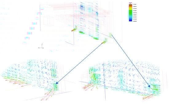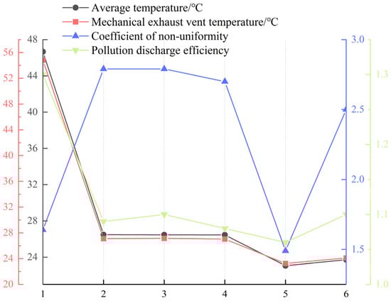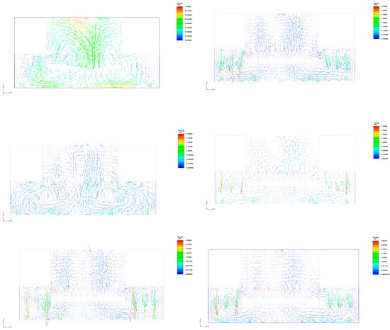 : velocity inhomogeneity coefficient. These points are evenly arranged within the main occupied zone at a height of 1.5 m, which is widely accepted as the reference level for thermal comfort evaluation in large-volume spaces. The coefficient values are calculated from CFD post-processing data using Airpak’s “Point Sampling” tool and processed in Excel. A lower  or  indicates a more uniform distribution, and thus a more comfortable thermal environment.