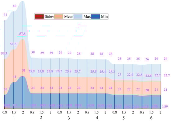 Average temperature is one of the basic indicators of the thermal environment of a stage space, reflecting the overall temperature level within the stage area. In this study, the average temperature not only helps to evaluate the effect of airflow optimization on temperature but also helps to verify the effectiveness of ventilation strategies in reducing heat load and improving comfort. The calculation method is as follows: