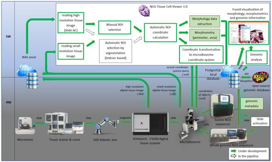 We aimed to streamline the extensive pathological workflow involving many commercialized pieces of equipment, from tissue preparation through gene mutation detection of single cells, ending in the collection of gene-specific drug targets. Until now, this process has been carried out step by step, requiring the expertise and manual efforts of multiple individuals to perform the tool-specific evaluation tasks separately. We provide a solution that involves the automation of processes, with the system design plan illustrated in Figure 1. The implementation of a digital and automated pathology workflow starts with the preparation of anonymized (written informed consent S1) tissue samples on membrane slides, their robotic high-throughput and high-resolution digital scanning [20], and the subsequent determination of their tissue abnormalities [21]. Then, it continues with the automated laser microdissection of these micrometer-sized tumor-suspicious cells and cell clusters, followed by the amplification of the excised cells and DNA sequencing. Previously, metadata from each step of the workflow could only be handled and examined separately. To smooth the workflow, we set the goal to integrate them into a common platform named Next Generation Sequencing (NGS) Viewer, which saves the created morphological, calculated morphometrical, and extracted genomic metadata from NGS with the collected open-source genomic data through the whole workflow. The workflow then analyzes them together and links the extracted information to cell coordinates. This tool provides physicians with a compact visual and fused analytical framework for tumor diagnostics as a decision-support framework. To ensure reproducibility, each primary step of the workflow is described in a dedicated subsection.