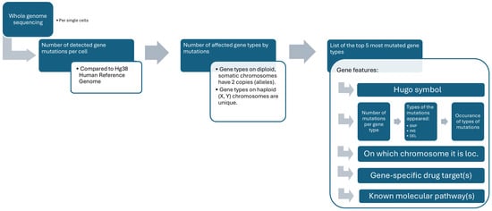 Under the unique identifier (ROI ) of a given cell, the number of gene mutations detected for that cell per chromosome type is listed in the “Total Gene Mutations” column. Since a gene can be damaged several times, the number of different types of genes affected by these gene mutations is stored in the “Affected Distinct Genes” column. Although a gene is found on only one chromosome (type), there are two copies of the 1–21 chromosomes per cell, so different types of genes also occur twice per cell. The exception to this is the sex-linked genes on chromosomes X and Y in males because there is only one of each of these chromosomes per cell. Thus, the mutations detected in them and the genes they affect can be confidently linked to a single chromosome. However, sequencing equipment is currently not able to determine which of the given diploid, somatic chromosome pairs has the particular type of damaged gene. It can only determine the chromosome type in which the damaged gene is located. Thus, the above column can only determine distinct types of genes, not the true number of genes actually affected. Here, we can use an approximation, for example, by multiplying the number of genes by two (or dividing the number of mutations by two), assuming that diploid pairs have the same probability of being damaged by mutations.