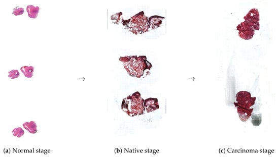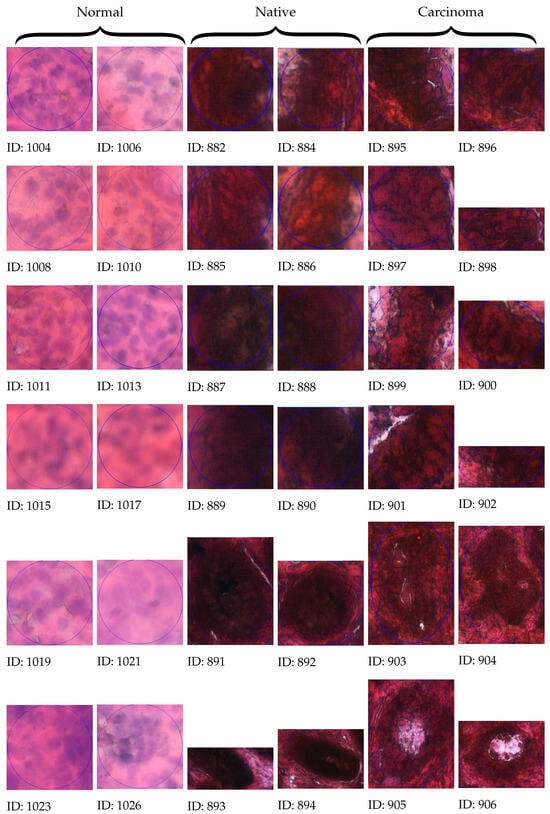 Once the reference points are marked on the slide presented in Figure 5a, one can start the morphological examination of the tissue sample and select suspicious areas, as shown in Figure 5b for further genomic analysis—even single-cell areas. Figure 6 displays the morphology of the selected regions from normal, native, and carcinoma tissue samples, with 12-12 samples per tumor state.