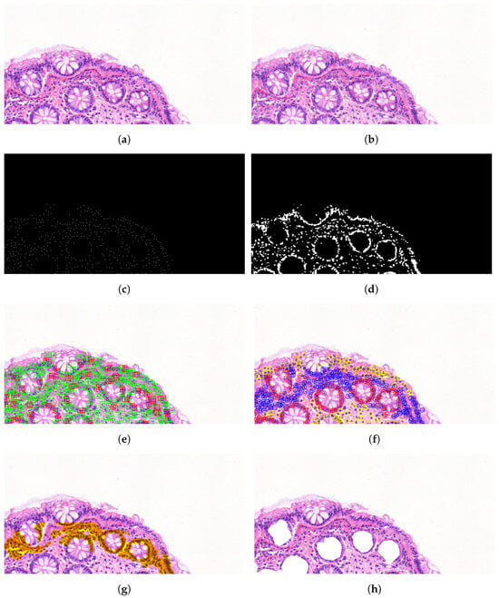 Panel (a) shows a selected region of interest extracted from the scanned digital tissue. In (b), the detected nuclei are overlaid in white on the original image to retain spatial context. The corresponding binary mask of these nuclei, shown in (c), highlights their density and spatial distribution, independent of tissue background. Full-cell regions are delineated in (d) by expanding from the nucleus boundaries using morphological constraints. Panel (e) presents a quality assessment of the segmented cells based on morphological criteria: cells within normal ranges are marked in green, while abnormal ones are marked in red. The classified cells in (f) are color-coded by tissue association: stromal (yellow), glandular (red), and epithelium-aligned (blue). Based on this classification, (g) shows the inferred surface epithelium region, while (h) displays the detected and masked gland areas derived from the clustering of gland-associated cells.