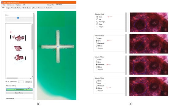 ROI selection process. (a) Reference points on the tissue slide are marked and saved to begin the morphological examination. (b) Optional shapes (circle, line, square, or ellipse) are selected to define regions of interest (ROIs) to be analyzed further, with the selected shape visible in the image viewer.