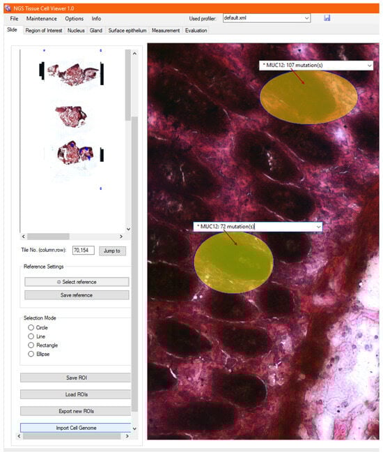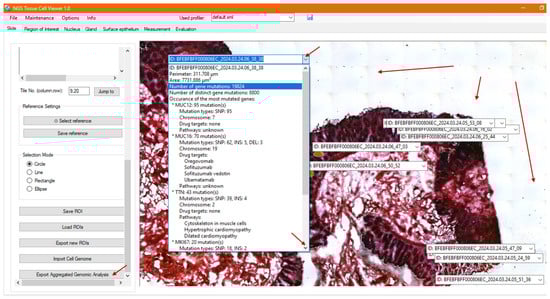 Due to the connection of genetic metadata and morphological coordinates in the database, the annotations could be placed directly above the ROI shapes. In order to minimize the obscuring of the morphological environment of the ROI, the annotations were formulated as drop-down and scrollable lists. They contain the evaluation results of a given ROI described in Section 2.8 that are retrieved in real time from the database with NpgSQL [42] and listed in batches. This allows for a more detailed observation of tumor heterogeneity.