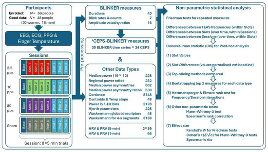 Here, we analyse eyeblink data from a larger and more recent study on TEAS alone (2015–2016, N = 66, of whom 41 were women and 25 were men), comparing the effects of different stimulation frequencies in four sessions spaced a week or more apart. We also extended the range of indices provided by BLINKER by using their time series as input for CEPS, an open access MATLAB® software package for the analysis of complexity and entropy in physiological signals [16,17]. We then compared effect sizes for the effects of TEAS frequency, session order, and time within sessions on the original and extended BLINKER measures, other EEG-derived indices, and different measures of heart rate variability (HRV) and pulse rate variability (PRV).