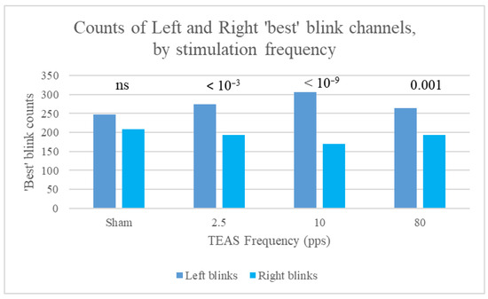 In 2013, aware that eyeblink rate (EBR) may be an indirect marker of striatal dopamine activity [10,11,12] and inversely correlated with parasympathetic activity [13,14], we presented a preliminary report based on four small pilot studies (N participants = 1 to 12) [15]. Our findings suggested that EBR increased more with electroacupuncture (EA), i.e., electrical stimulation applied using needle electrodes, than with gentle manual acupuncture (MA), that EBR increased more with 20 min than 5 min of EA, and that EBR decreased following EA. These results were all statistically encouraging, with p-values < 0.001 for Wilcoxon signed-rank and binomial tests. A finding that did not attain statistical significance was that EBR was usually greater for transcutaneous EA stimulation (TEAS)—i.e., transcutaneous electrical nerve stimulation (TENS) applied to acupuncture points—than for MA. In addition, we observed differences in EBR that failed to reach statistical significance with stimulation frequency in cycles per second (2.5 Hz or 10 Hz), and that EBR appeared to increase more with 20 min than with 5 min of EA.