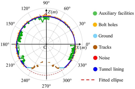 To enhance robustness of ellipse fitting, points corresponding to tracks and ground are excluded during the random sampling process, as these irrelevant or outlier points are geometrically distant from the tunnel lining. Including these irrelevant points in the process of fitting could distort the ellipse fitting and compromise the accuracy of cross-sectional geometry extraction. A polar coordinate system is introduced to streamline the process. The mean coordinates  of all points in each slice are calculated and serve as the origin of the polar coordinate system. For each point, polar coordinates  relative to this origin  are derived using Equation (2).
