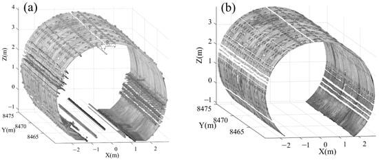Example results of point cloud data preprocessing. (a) Raw point cloud. (b) Denoised point cloud.