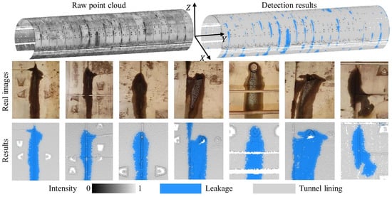 - Xu, T.; Xu, L.; Li, X.; Yao, J. Detection of water leakage in underground tunnels using corrected intensity data and 3D point cloud of terrestrial laser scanning. IEEE Access 2018, 6, 32471–32480. [Google Scholar] [CrossRef]