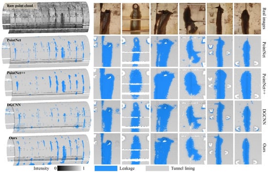 These quantitative findings are further supported by the qualitative results illustrated in Figure 9. While all three deep learning models effectively detect leakages, they exhibit certain limitations; PointNet++ is prone to over-segmentation, and both DGCNN and PointNet misclassify some tunnel lining points as leakage. In contrast, the proposed method successfully discriminates between leakages and tunnel lining, achieving a more precise segmentation that aligns closely with the ground truth shapes.