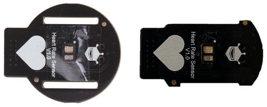 During the tests, to determine the higher contact pressure values without causing an uncomfortable feeling of constriction on the participants’ wrists, the printed circuit board on the PPG sensor was milled into the lateral side with no electrical circuits (Figure 3).