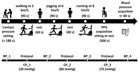 Specifically, each participant was asked to perform three test sessions on a treadmill at different speeds (i.e., 3, 6, and 8 km/h for 90 s at each speed), with 60 s rest in between. After the third session at 8 km/h, each participant was asked to sit still at rest for 5 min while acquiring the PPG signal and then to have the last blood pressure measurement taken (BP_4).