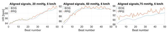 Examples of the test (PPG) and reference (ECG-based) acquired signals (speed: 6 km/h; contact pressure: 20, 60, 75 mmHg; skin color: 2; subject 23).