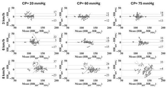 Evaluating the effect of the contact pressure on the quality of the PPG signal during activity execution is extremely interesting, since PPG-based wearables are notably prone to motion artifacts. Studies in the literature [20] consider the HR measurement as reliable when the mean absolute percentage error (MAPE) is lower than 5% and the linear correlation with the reference value is strong (i.e., ρ > 0.7). Upon this basis, all the values measured at a walking speed of 3 km/h can be considered reliable (MAPE within the range 3.36–4.99, ρ ≥ 0.77), regardless of the CP (Table 2). On the other hand, when running is considered, the results cannot be considered acceptable at a CP of 20 mmHg (MAPE = 6.11%, ρ = 0.62), but they are acceptable at higher CP values (best with a CP of 60 mmHg, with MAPE = 3.62% and ρ = 0.80, whereas with CP = 75 mmHg MAPE is 4.73% and ρ is 0.75, and this still considered reliable). At 8 km/h none of the CP values allow us to obtain accurate HR values; this can be attributed to the high variability in the measurement results, as can be observed in the Bland–Altman plot (Figure 6, right). If a specific CP value is considered, the MAPE increases with the activity level, as expected, due to possible motion artifacts. On the other hand, the value of the correlation coefficient decreases due to a worsening correlation with the reference values. It is feasible to assume that at the highest contact pressure (i.e., 75 mmHg) and at the highest exercise intensity (i.e., 8 km/h) the effect of the tightening, combined with the lower damping, has a compressive effect on the capillary bed, causing a significant decrease in the signal quality.