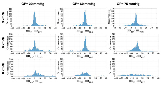 These considerations are directly reflected in the analysis of the measurement differences (residuals), as observed in Table 4. The distribution is tighter with a CP equal to 60 mmHg and a walking/running speed up to 6 km/h (Figure 7). Precision and trueness reached their best values at the same CP of 60 mmHg for any intensity of physical activity, as seen in Table 4 and Figure 6. Specifically, the confidence intervals (coverage factor k = 1.96) varied from [−12, 10] bpm at 3 km/h to [−23, 23] bpm at 8 km/h, with a mean value of −1 bpm and 0 bpm, respectively. At 8 km/h the residuals seem not to have a defined distribution, appearing almost casual.