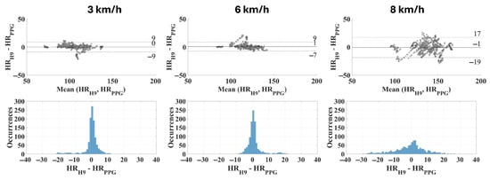 The accuracy and precision at each speed and for each contact pressure were assessed using the MAPE (Table 2) and the Pearson’s correlation coefficient (Table 3), as well as through an analysis of the deviations between the HR values measured by the PPG-based and the ECG-based systems (Table 4).