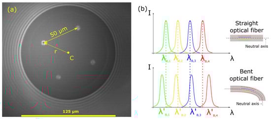 (a) Microscopic image of the bend-sensitive 4-core SM-4C1500 optical fiber. (b) Bend-sensing principle in multi-core optical fibers with FBGs inscribed in their cores.