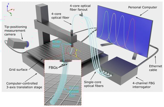In the present work, the curvature vector κ is calculated from the Bragg wavelength shifts of the four-core optical fiber in order to determine the tip position of a bend-sensitive optical fiber protruding from a probe, using a set of experimentally measured tip position values as the initial calibration values. The setup for the experimental measurement of the optical fiber bend angle and direction is shown in Figure 2, and it comprises a modified Fused Deposition Modeling 3D printer whose role is to act as a computer-controlled 3-axis translation stage with a 50 μm step resolution. The print head is removed and substituted by the bend-sensitive optical fiber probe head, while the print bed is overlaid with a 1 mm spacing grid mesh in order to be able to determine the optical fiber tip x- and y-axis values. In this case, x and y values refer to the planar coordinates perpendicular to the optical fiber longitudinal axis, and the z-axis is defined as the axis parallel to the bend-sensitive optical fiber length (see coordinate system on the upper left corner of Figure 2). A digital camera is used to capture images sequentially as the optical fiber tip is deformed. The images are used to extract the optical fiber tip deformation values during the experiment. The inscribed FBGs are located at the clamping point of the optical fiber to the probe head with the middle of the 4 mm long FBGs being roughly in the middle of the clamping zone, as determined by the cross-sectional area of an M2 screw (see inset in Figure 2). The optical fiber is protected by a 900 μm outer diameter furcation tube (FT900Y Hytrel furcation tube from Thorlabs, Newton, NJ, USA) with a 400 μm inner diameter, and the total optical fiber length protruding from the probe head is 14.5 mm (distance L in Figure 2). For the given optical fiber protrusion length, the response of the sensor is indifferent to the furcation tubing material, but the latter will affect the force required by the user to bend the fiber. A different optical fiber protrusion length, however, requires a new calibration procedure to determine a new polynomial parameter set, as it will be described later in the text. Fiber Gragg Grating spectra are acquired by a commercially available 4-channel FBG interrogator (FemtoSensing International, Atlanta, GA, USA), and the interface between the 4-core optical fiber and the FBG interrogator is through a 4-port optical fiber fanout (Meisu Optics, Zhongshan, China).