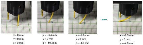After the leveling procedure, tip coordinate determination followed, which acts as the ground truth and calibration table for the algorithmic reconstruction. A g-code script was used to move the z-axis towards the grid mesh table at a step of 0.5 mm with a positioning error of 50 μm (0.50 mm step ± 0.05 mm). At each step, the optical fiber was aligned along a predetermined axis direction (x or y), and consequent camera images were taken in order to determine the tip location, as shown in the picture sequence of Figure 3.