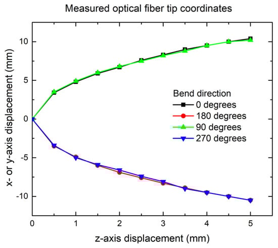 The resulting geometrical space of the tip position for various z-axis displacements is plotted in Figure 4 for four different directions in the x- and y-axes (optical fiber bent in the +x-axis direction is the 0 degrees orientation, +y-direction bend is 90 degrees, −x is 180 degrees, and finally, the −y direction is 270 degrees). It should be noted that these experimentally derived results are unique to this particular combination of optical fiber–furcation tube, and if the furcation tube would be made of a different material or of a different diameter, these results would have to be updated with new measurements. The overlapping results in both the x and y directions and for both positive and negative displacements show an excellent surface leveling procedure.