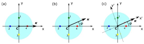 (a) Original calibration coordinate system with core #4 aligned to the Cx-axis. (b) An arbitrary optical fiber curvature κ at angle φ with respect to the x-axis and (c) rotation of the coordinate system by angle φ with respect to the original coordinate system.