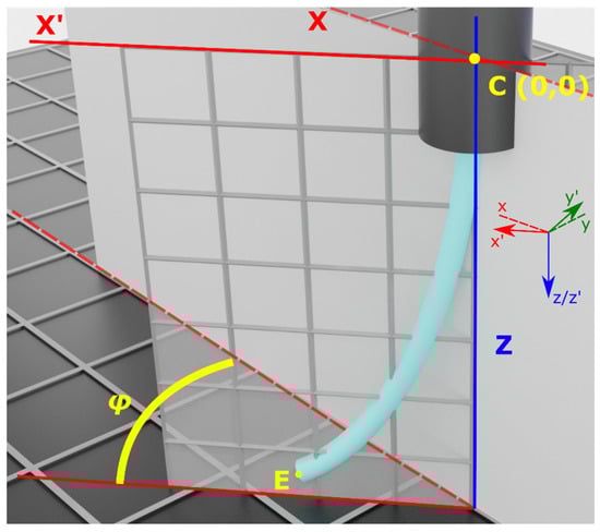 Coordinate system rotation by an angle φ. The original coordinate system is defined by plane zCx, while the rotated coordinate system is defined by plane zCx′. Ultimately, endpoint E coordinates are extracted with respect to the original coordinate system zCx.